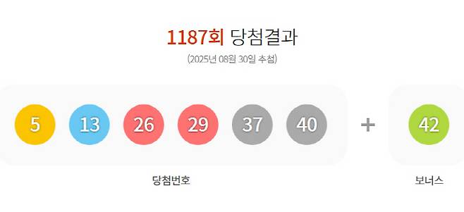 30일 저녁 8시 35분 MBC '생방송 행복드림 로또 6/45'를 통해 진행된 제1187회 로또 당첨번호 추첨 결과 1등은 '5, 13, 26, 29, 37, 40'번이 뽑혔다.