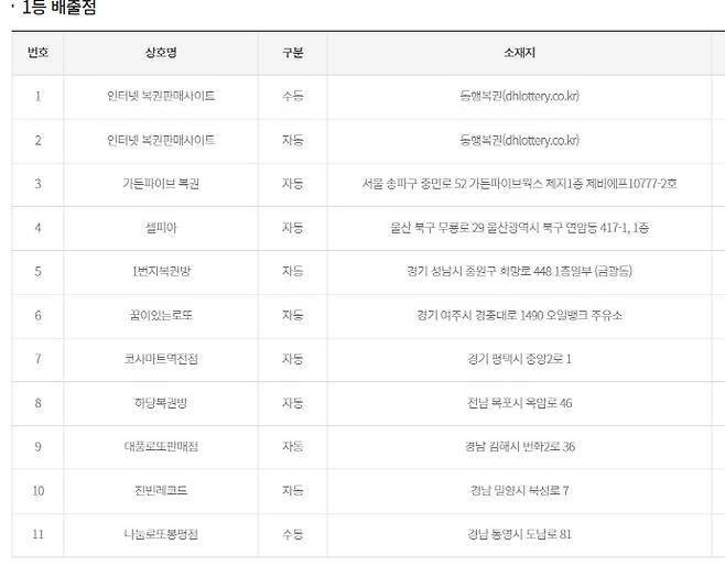시도별 1등 판매점은 서울 1, 울산 1, 경기 3, 전남 1, 경남 3, 동행복권 2곳이다. 전남 1등 판매점은 하당복권방(자동·전남 목포시 옥암로 46)이다.