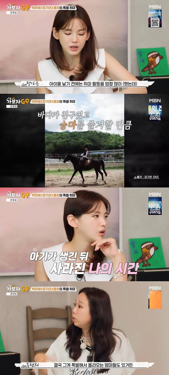 이를 들은 홍현희는 "아이를 위해서 사나보다"라고 말했고, 정가은은 아이를 낳기 전에는 취미 활동을 많이 했다며 "스킨스쿠버도 되게 좋아하고 바다 들어가는 것도 좋아하고 승마단도 했었고 레포츠를 좋아하는데 아기가 생기니까 그걸 할 시간이 없는 거다"라고 털어놨다.