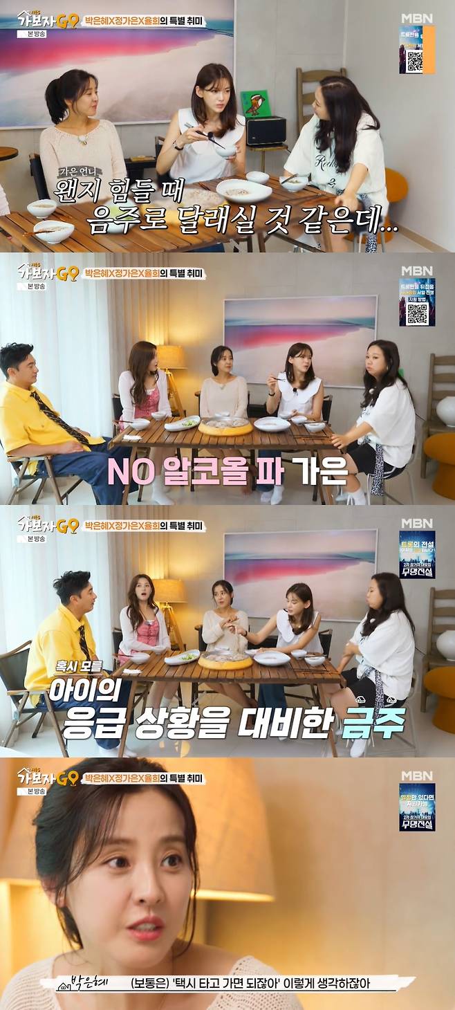 정가은은 "혹시 모르니까" 안 마신다고 말했고, 박은혜는 "우리는 '택시 타면 되잖아', '취할 정도로 안 마시면 되는데' 하지 않냐"라고 전했다.