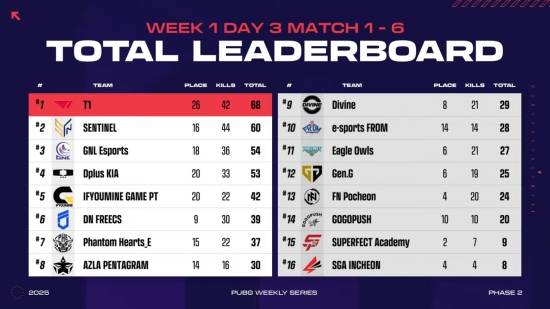 위클리 스테이지 1주 차 DAY3 경기를 모두 소화한 결과, T1이 68점으로 1위에 올랐다.