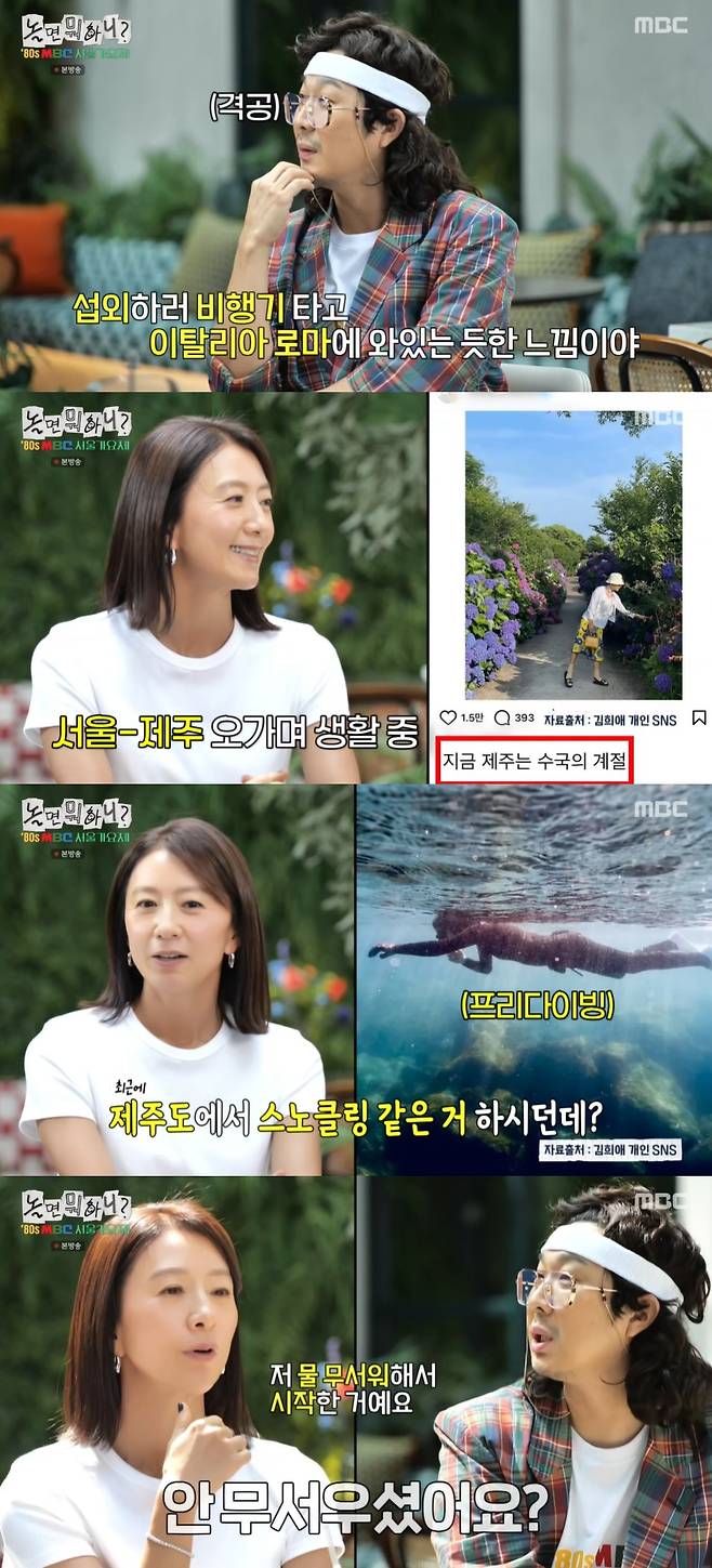 하하는 제주에서 며칠 전 올라왔다는 김희애에게 "제주살이를 하냐"라고 물었고, 김희애는 "반반씩"하고 있다며 근황을 알렸다.