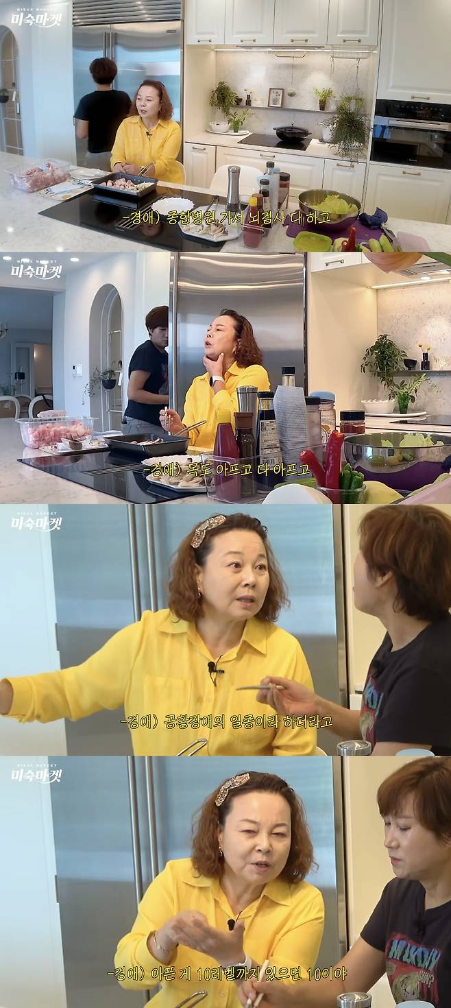 이어 "제가 얼마 전에 많이 아팠다"라며 운을 떼며 "종합병원에 가서 뇌 검사를 했는데 후두 신경통이더라. 대신경통, 소신경통, 삼신경통이 다 아팠다"라고 털어놨다. 이경애는 "귀랑 목도 아파서 이빈인후과도 다니고 치과도 다녔다. 병원이라는 병원을 다 다녔다. 최근엔 아파서 병원에 간 게 다다. 신경병을 앓은 건데 공황장애의 일종이라고 한다. 통증이 레벨 10까지 있다면 10까지 느꼈다. 이후 약침을 맞았는데 욱씬거린 게 멈췄다"라며 현재는 회복된 상황이라고 전했다.
