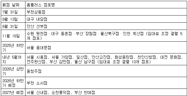 동대문점은 올해 하반기, 동청주점은 내년 상반기, 부천소사점은 내년 하반기에 각각 문을 닫는다. 서울 신내점과 순천풍덕점, 부산 반여점은 오는 2027년 폐점이 예정돼 있다.