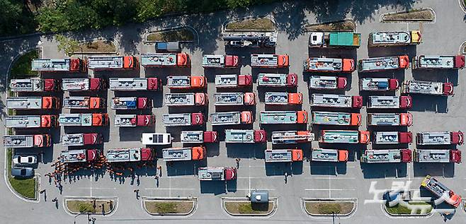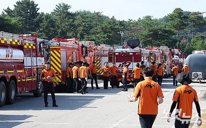 최악의 가뭄에 시달리는 강원 강릉시의 생활용수 87%를 공급하는 오봉저수지의 저수율이 15% 아래로 떨어진 31일 오전 강원 강릉시 강북공설운동장에 국가소방동원령에 따라 전국서 물탱크차 50대와 급배수지원차 1대 등이 집결해 급수 지원 활동을 준비하고 있다.