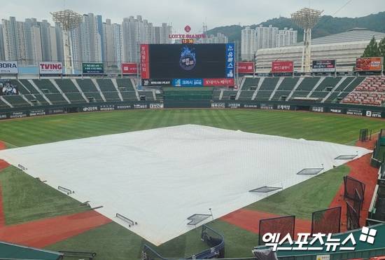 (엑스포츠뉴스 부산, 김근한 기자) 부산 사직야구장 그라운드에 대형 방수포가 일찌감치 깔렸다.