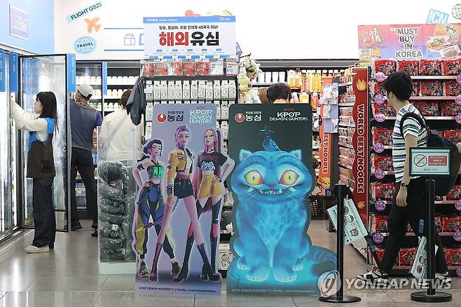 (영종도=연합뉴스) 강민지 기자 = 31일 인천국제공항 제2여객터미널 GS25 편의점에 장식된 영화 '케이팝 데몬 헌터스' 제품 홍보물이 눈길을 끌고 있다. 2025.8.31