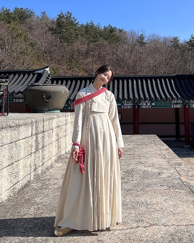 사진 속 임윤아는 붉은 오랏줄에 팔이 묶인 채 대본을 집중해서 읽고 있는 모습, 궁궐 세트장에서 전통 한복을 입고 서 있는 모습이다.