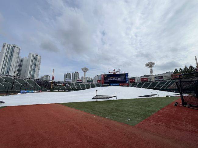 오전 늦은 시간에 비가 뿌리기 시작했지만 그리 많은 양은 아니었고 이미 그친 상황. 또한 그라운드에도 일찌감치 대형 방수포가 설치되어 그라운드를 보호하고 있었다. 롯데 선수단도 가볍게 몸을 풀면서 경기를 준비하고 있다.
