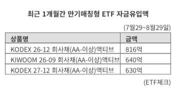 31일 금융정보 플랫폼 ETF체크에 따르면 최근 1개월간 만기매칭형 채권 ETF인 'KODEX 26-12 회사채(AA-이상)액티브'에는 816억원의 자금이 유입됐다. 이 기간 국내 채권형 ETF 중 자금 유입 규모가 두 번째로 많다. 이 상품은 우량 회사채에 투자하는 만기매칭형 ETF다. 자금 유입 4·5위도 만기매칭형 채권 ETF다. KIWOOM 26-09 회사채(AA-이상)액티브에 640억원, KODEX 27-12 회사채(AA-이상)액티브에 630억원이 유입됐다.