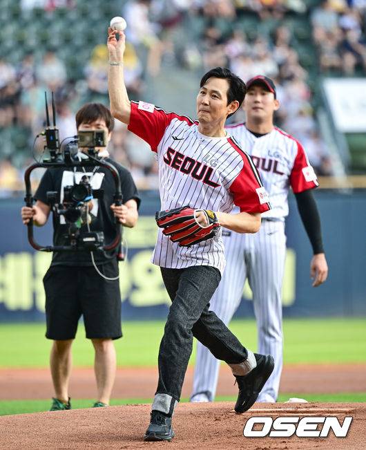배우 이정재가 시구를 하고 있다. 2025.08.31 /cej@osen.co.kr