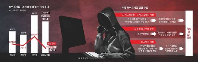 올해 1~7월 보이스피싱·스미싱 피해액이 8000억원에 육박하는 등 역대 최고치를 기록한 것은 그만큼 피싱조직의 수법이 진화하고 있어서다. “서울중앙지검 ○○○ 검사입니다”, “금융감독원 ○○○입니다” 등 기관 단 1곳을 사칭하면서 범죄에 연루됐다며 출금을 유도하는 ‘고전 방식’은 사라지는 추세다.