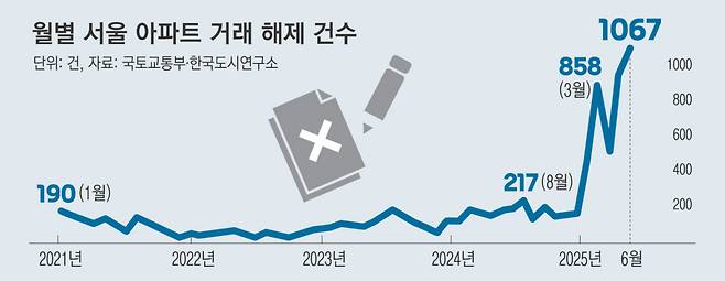 지난 4년간 월별 100건 안팎에 그쳤던 서울 아파트 매매계약 취소가 올해 상반기 급증해 지난 6월 1000건을 넘어선 것으로 집계됐다. 취소된 3건 중 1건은 계약 당시 최고가 거래였다. 급격히 늘어난 거래 취소가 최근 서울 아파트 가격 상승에 영향을 줬다는 분석이 나온다.