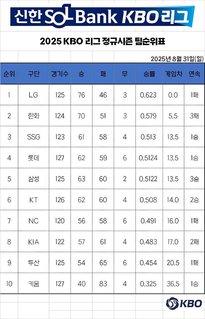 8월의 마지막 밤(31일)에도 '1승'을 향한 에스에스지(SSG) 랜더스, 롯데 자이언츠, 삼성 라이온즈, 케이티(KT) 위즈, 엔씨(NC) 다이노스, 기아(KIA) 타이거즈 등 6개 팀의 사투가 이어졌다.