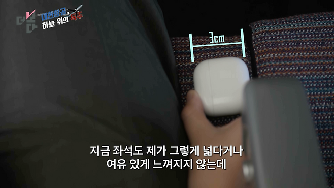 이 정도 길이가 3cm인데 지금 좌석도 제가 그렇게 넓다 있다 넓다 여유 있게 느껴지지 않는데 여기서 3cm가 더 줄어드는 거거든요. 성인 남자들 기준으로는 확실히 좀 더 딱 맞다 아니면 좀 더 좁다 이런 느낌을 받게 될 것 같아요.