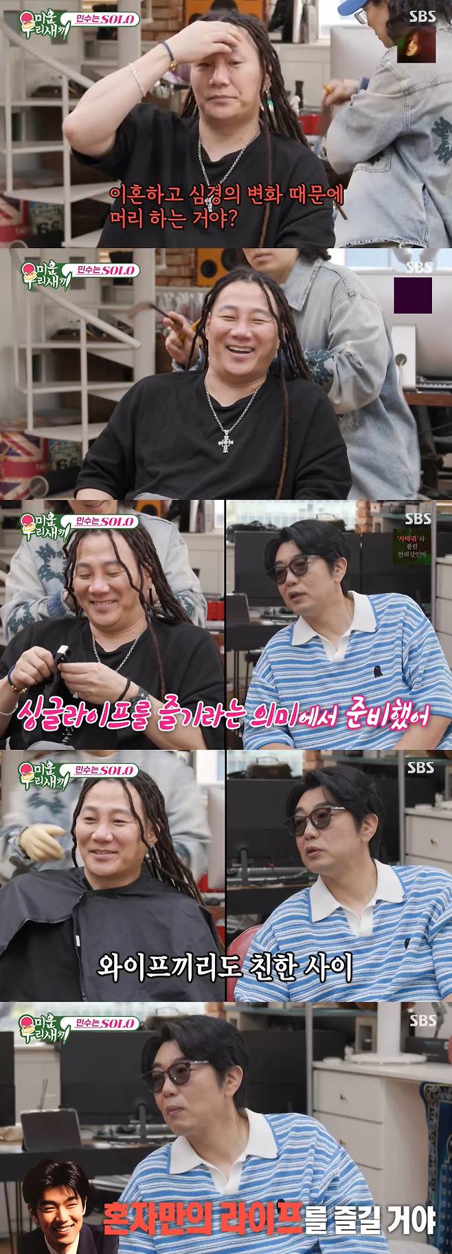윤민수는 "머리 멋있지 않냐"라며 드레드락 헤어를 자랑했고 이종혁은 "이혼하고 심경의 변화 때문에 머리 하는 거냐"라고 놀렸다.