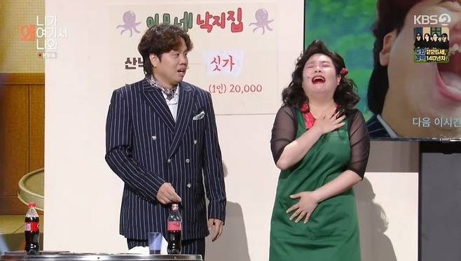 그런 가운데 '니가 왜 여기서 나와' 코너에선 김영희, 이현정, 김지영이 막장 드라마에 악역으로 나온 정승환이 오자 메뉴판이 없다고 거짓말했다. 정승환이 콜라 쿠폰을 내밀자 김영희는 콜라를 흔든 후 가져다주기도.