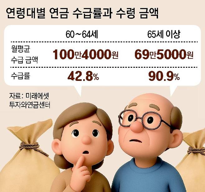 상황이 이렇다 보니 퇴직 후 공적연금을 수령할 때까지 소득 공백이 발생하게 된다. 한국 직장인의 법정 정년은 60세다. 하지만 기초연금은 65세가 되어야 받을 수 있다. 국민연금 가입자가 노후에 받는 노령연금 개시 시기는 출생 연도에 따라 정해진다. 1961∼64년생은 63세, 1965∼68년생은 64세, 1969년 이후 출생자는 65세부터 노령연금을 받을 수 있다. 정년까지 일하더라도 기초연금과 국민연금을 받기까지 3∼5년 정도 소득 공백을 견뎌야 한다. 앞서 65세 이상 고령자에서 90%가 넘던 연금 수급 비율이 60∼64세 인구에서는 42.8%로 급락했다. 2023년 당시 노령연금은 63세부터 받을 수 있었는데, 노령연금을 수령하기 이전인 60∼62세 인구에서 연금 수급 비율은 겨우 24.8%밖에 안 됐다.