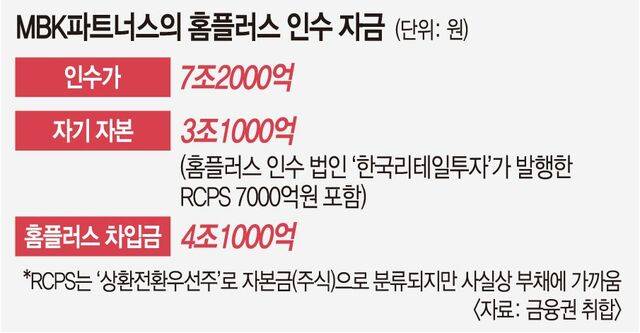 금융권에서는 MBK가 홈플러스를 인수하며 낸 과도한 빚을 갚기 급급해 온라인 대응에 실패, 경쟁력을 잃었다고 지적한다. MBK는 영국 테스코에서 홈플러스 지분 100%를 가져오기 위해 7조2000억원을 베팅했는데 이 중 자기 돈은 2조4000억원뿐이었다. 나머지는 자본금 개념이지만 사실상 빚인 RCPS 7000억원과 홈플러스 주식·부동산을 바탕으로 홈플러스가 빌린 돈(인수 금융 등) 4조1000억원으로 메웠다.