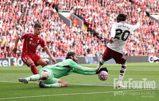 아스널도 반격했다. 전반 22분 박스 중앙에서 공을 잡은 마두에케가 먼 거리에서 과감한 왼발 중거리를 시도했지만, 알리송이 선방했다.