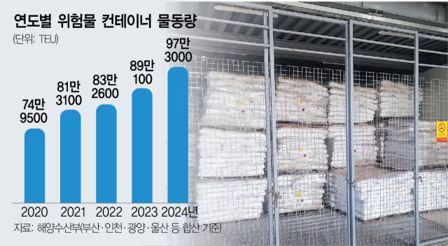 화재나 폭발 위험이 있는 물질은 사실상 국내 반입 단계에서부터 관리 부실이 만연해 있다. 반도체와 배터리를 포함한 첨단산업의 발전으로 위험물질 취급 수요는 폭발적으로 증가했지만 안전 관리에 대한 인식은 이를 따라가지 못하는 실정이다. 해양수산부에 따르면 2020년 74만 9000TEU였던 전국 국가관리 항만의 위험물 컨테이너 수출입 물동량은 지난해 97만3000TEU까지 연평균 6.8% 증가했다. 같은 기간 위험물 컨테이너 점검에서 위반 사실이 적발된 사례는 총 1890건에 달했다. 표본조사 방식이라는 점을 감안하면 발견되지 않은 위반 사례는 더욱 많을 것으로 보인다.