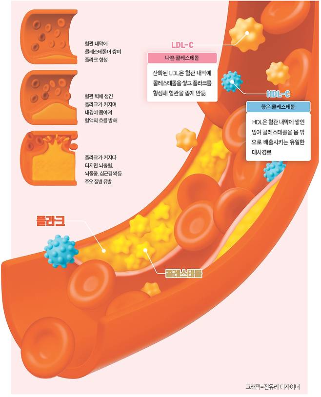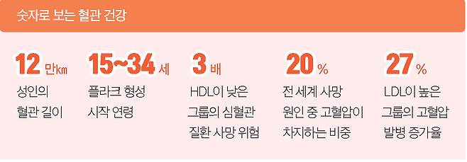 혈관은 몸 곳곳에 산소와 영양을 공급하는 수송로다. 성인의 혈관 길이는 약 12만㎞로 지구를 세 바퀴가량 도는 길이와 비슷하다. 이 통로가 콜레스테롤 때문에 좁아지고 막히면 심장·뇌를 한순간에 위협한다.