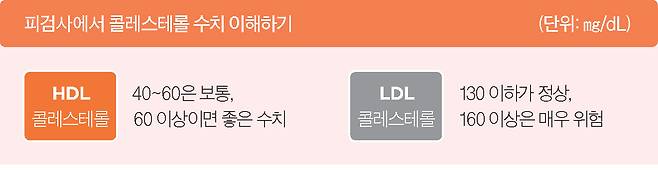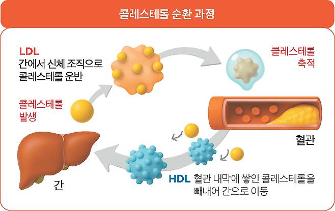 콜레스테롤은 세포막을 만들고 성호르몬과 비타민D를 합성하는 데 필수다. 기름 성분이라 물 같은 혈액에 그냥 떠다닐 수 없어서 단백질과 짝을 이뤄 운반체(지단백) 형태로 이동한다. 운반체에 단백질이 많아 상대적으로 단단하고 무거운 것이 HDL(고밀도지단백)이다. 반면에 단백질이 적고 지방이 많은 것이 LDL(저밀도지단백)이다. 각각 좋은 콜레스테롤, 나쁜 콜레스테롤이라고도 불린다.