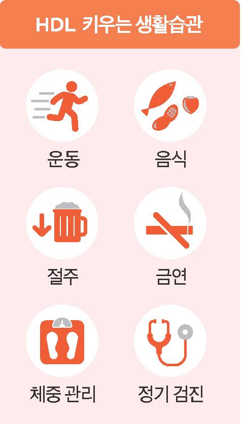 빠르게 걷기, 자전거 타기, 수영처럼 땀이 날 정도로 하는 운동은 HDL 수치를 끌어올린다. 올리브유·견과류·등푸른 생선에 들어 있는 불포화지방산은 HDL을 높이고 LDL은 줄이는 데 도움을 준다. 과음·흡연·복부 비만은 HDL 수치를 떨어뜨리고 혈관을 손상한다.