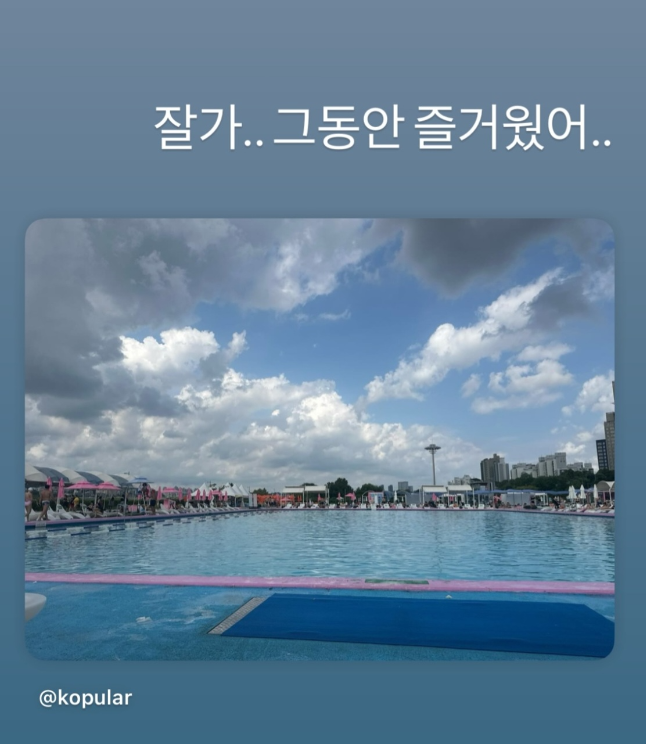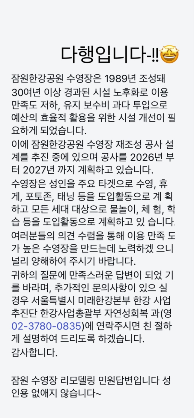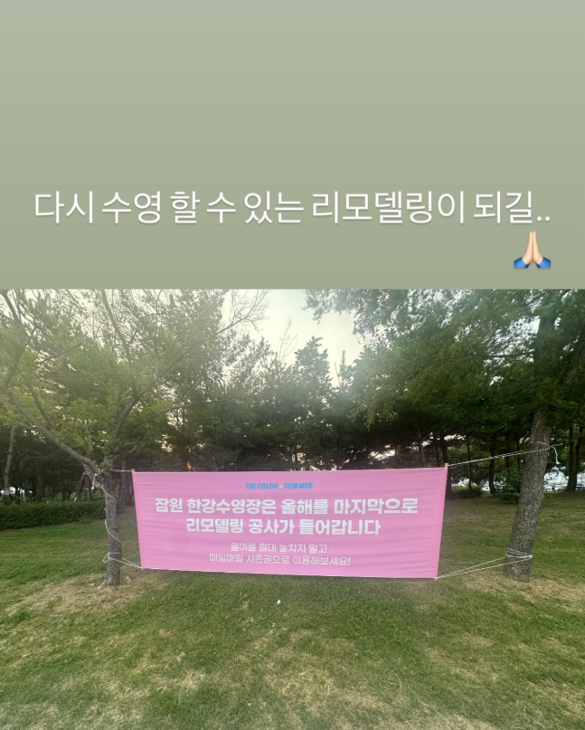 그는 “그동안 수영장에서 소소하고 행복한 추억이 많았다”며 “바람이 있다면 내년에도 잠원 한강 수영장 만큼은 유지됐으면 한다”고 덧붙였다.