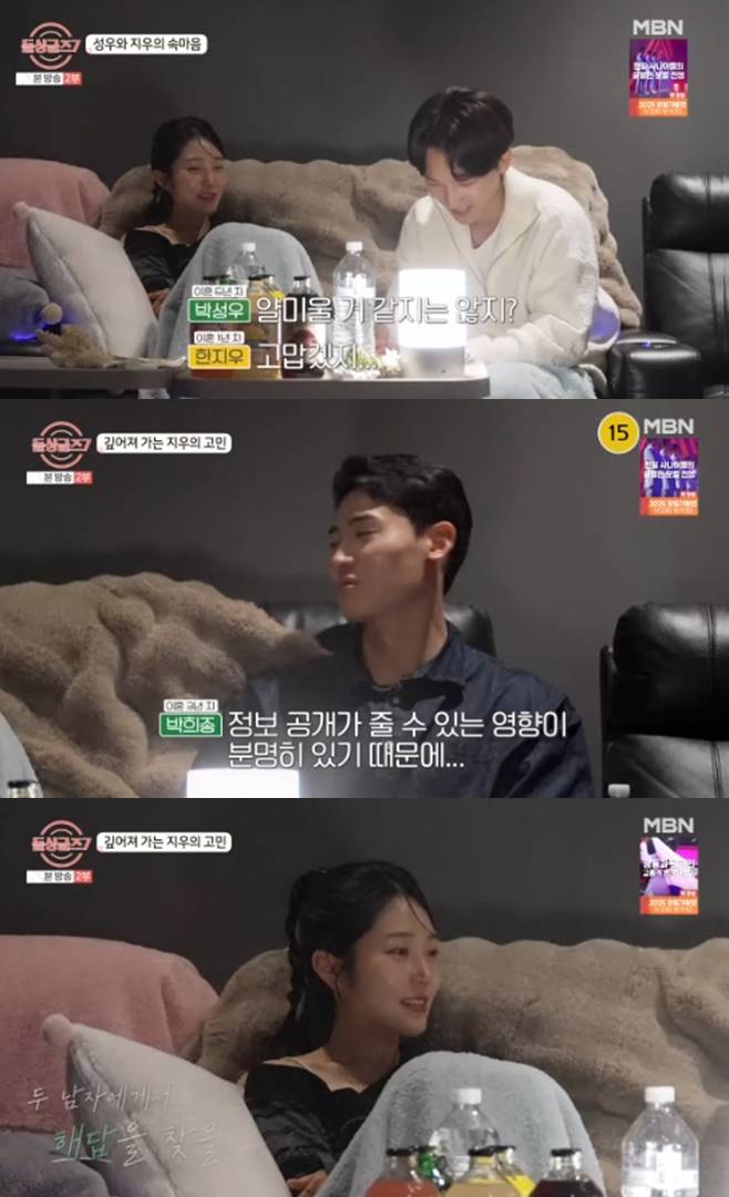 이날 두 번의 이혼 경험이 있는 한지우는 정보 공개를 앞두고 극도의 긴장감을 드러냈다. 한지우는 자신에게 호감을 드러내는 박희종과 박성우에게 정보 공개를 언급하며 조심스러운 마음을 고백했다.