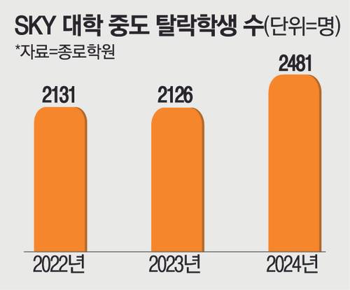 31일 종로학원이 대학알리미 공시를 분석한 결과 지난해 ‘SKY 대학’ 중도 탈락 학생 수는 2481명으로 사상 최다를 기록했다. 이는 대학알리미에 중도 탈락 인원 공시가 시작된 2007년 889명 대비 2.8배가량 늘어난 규모다. 중도 탈락은 자퇴, 미등록, 미복학, 유급 등의 사유로 학교에 복귀하지 않은 학생을 뜻한다.