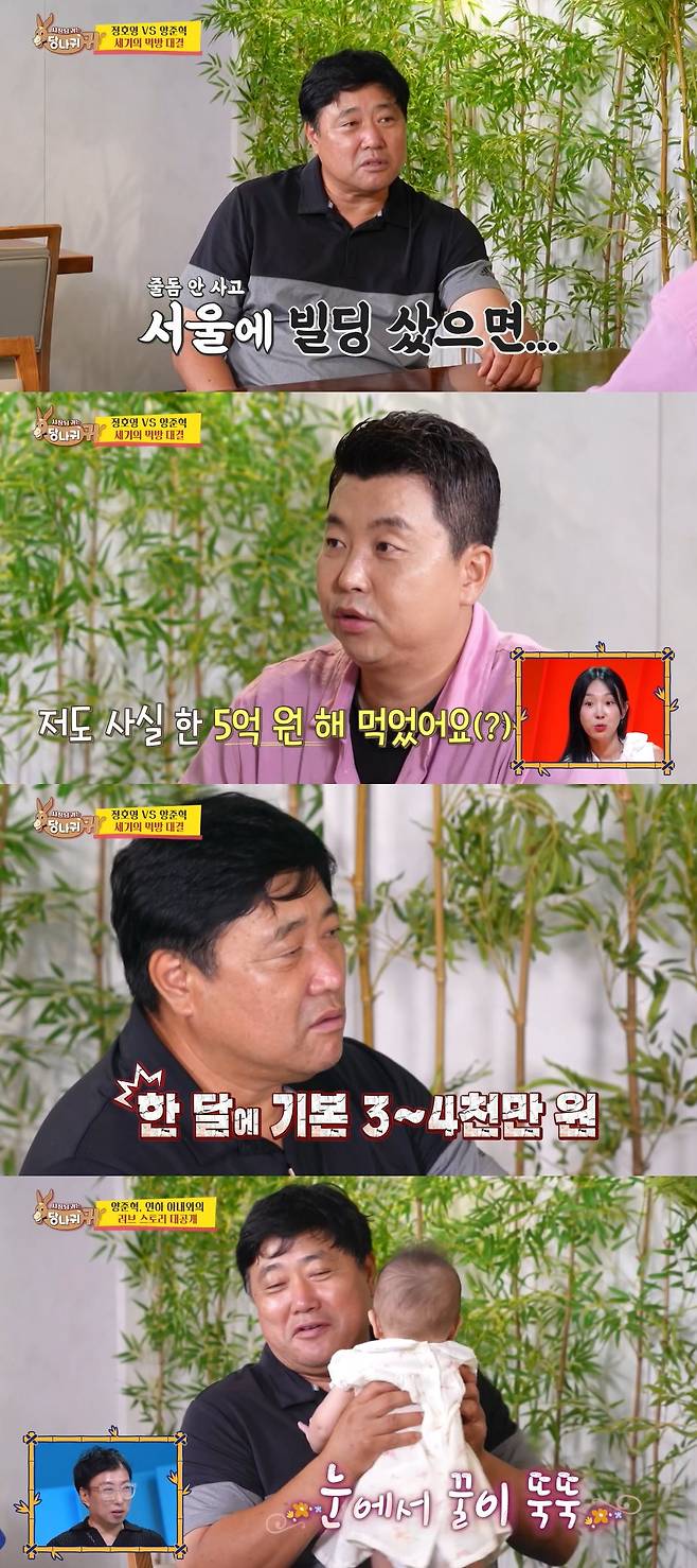 정호영 또한 "저도 코로나19 때문에 5억 해 먹었다"라며 날린 돈을 밝혔는데, 양준혁은 "5억 정도는 괜찮다"라며 "(나는) 한 달에 기본 3천만 원~4천만 원은 그냥 나갔다. 그래도 우리 아내가 아기까지 있는데 카페까지 맡아서 하니까 미안하기도 하고 고맙기도 하다"라며 아내에 대한 고마움을 전했다.