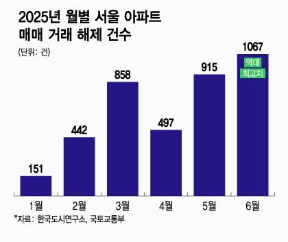 거래 해제가 전체 거래에서 차지하는 비중도 급등했다. 2024년 내내 해제 비율은 1.9~4.6% 수준으로 연중 5%를 넘은 적이 없었다. 그러나 올해 들어 상황이 달라졌다. 2월 6.6%에 △3월 8.2% △4월 9.0% △5월 11.1% △6월 8.9%를 기록했다. 단순한 변동을 넘어 시장 불안정 신호로 볼 수 있다는 분석이다.