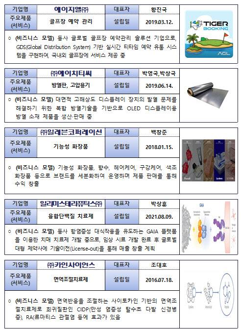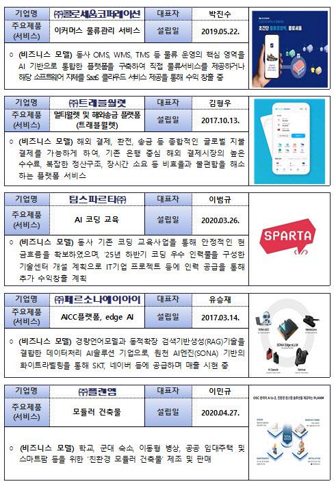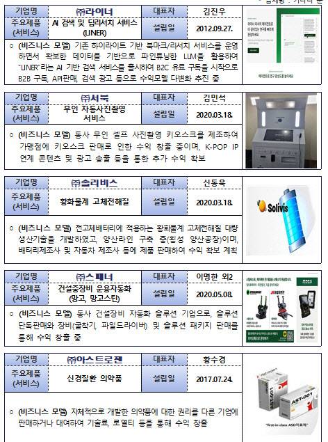 선정 기업은 가나다 순으로 라이너, 서북, 솔리비스, 스패너, 아스트로젠, 에이지엘, 에이치티씨, 일레븐코퍼레이션, 일리미스테라퓨틱스, 카인사이언스, 콜로세움코퍼레이션, 트래블월렛, 팀스파르타, 페르소나에이아이, 플랜엠 등 15곳이다.