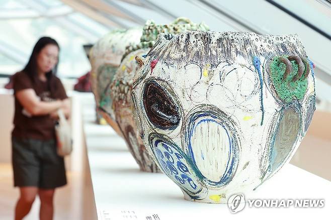 (서울=연합뉴스) 진연수 기자 = 1일 서울 중구 동대문디자인플라자(DDP)에서 열린 디자인 마이애미 아시아 첫 전시 '창작의 빛: 한국을 비추다'에서 참석자가 작품을 관람하고 있다.