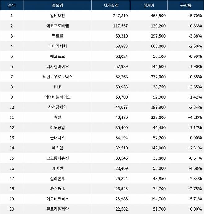 한편, 시가총액 20위권 종목들은 알테오젠(196170) ▲5.70%, 에코프로비엠(247540) ▼0.83%, 펩트론(087010) ▼3.88%, 파마리서치(214450) ▼2.50%, 에코프로(086520)(086520) ▼0.99%, 리가켐바이오(141080)(182400) ▼1.90%, 레인보우로보틱스(277810)(277810) ▼0.55%, HLB(028300) ▲2.65%, 에이비엘바이오(298380) ▲1.42%, 삼천당제약(000250) ▼2.34% 등의 성적을 기록하고 있다.