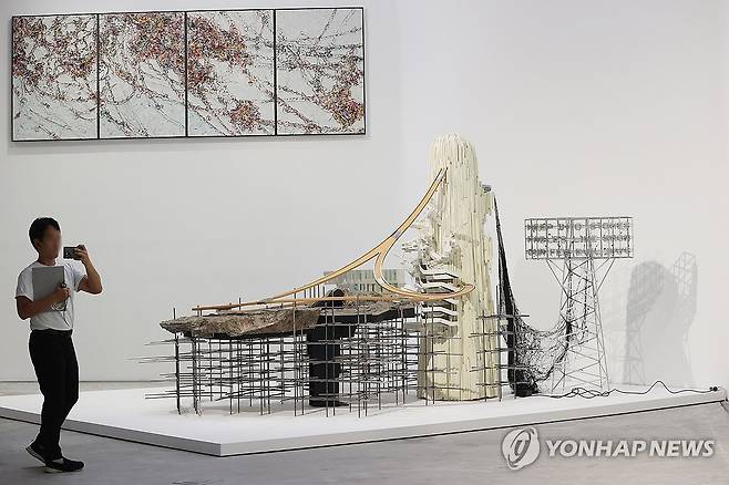 (서울=연합뉴스) 강민지 기자 = 1일 서울 용산구 리움미술관에서 열린 '이불:1998년 이후' 기자간담회에서 참석자가 '몽그랑레시:바위에 흐느끼다...'을 둘러보고 있다. 2025.9.1