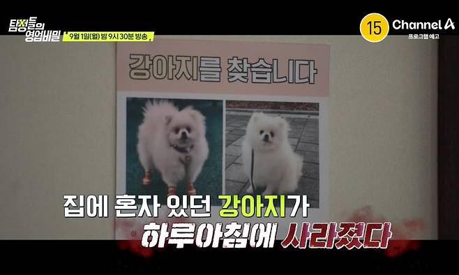 1일 방송되는 채널A 예능 프로그램 '탐정들의 영업비밀'에서는 한 여성 의뢰인의 사연을 중심으로 긴장감 넘치는 사건 추적이 펼쳐진다. '사라진 강아지를 찾아달라'는 절박한 요청을 받은 탐정단은 집 안에서 홀연히 사라진 반려견의 행방을 추적한다.