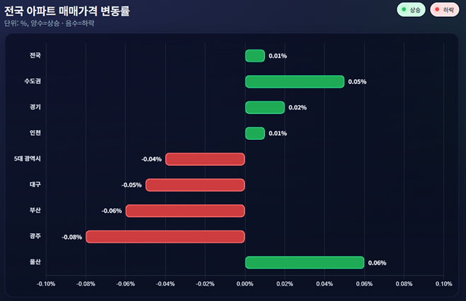 반면 5대 광역시는 -0.04% 하락했고, 대구(-0.05%), 부산(-0.06%), 광주(-0.08%)가 약세를 보였다. 울산만 0.06% 올라 26주 연속 상승세를 이어갔다.