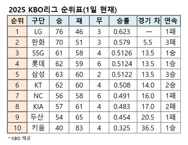 2025 KBO리그 정규 시즌이 전체 98경기(13.6%)밖에 남지 않은 가운데, 3위 에스에스지(SSG) 랜더스(승률 0.5126)와 4위 롯데 자이언츠(0.5124), 그리고 5위 삼성 라이온즈(0.5122)가 3위 자리를 놓고 승차 없이 소수점 네 자릿수 승률 전쟁을 벌이고 있다.