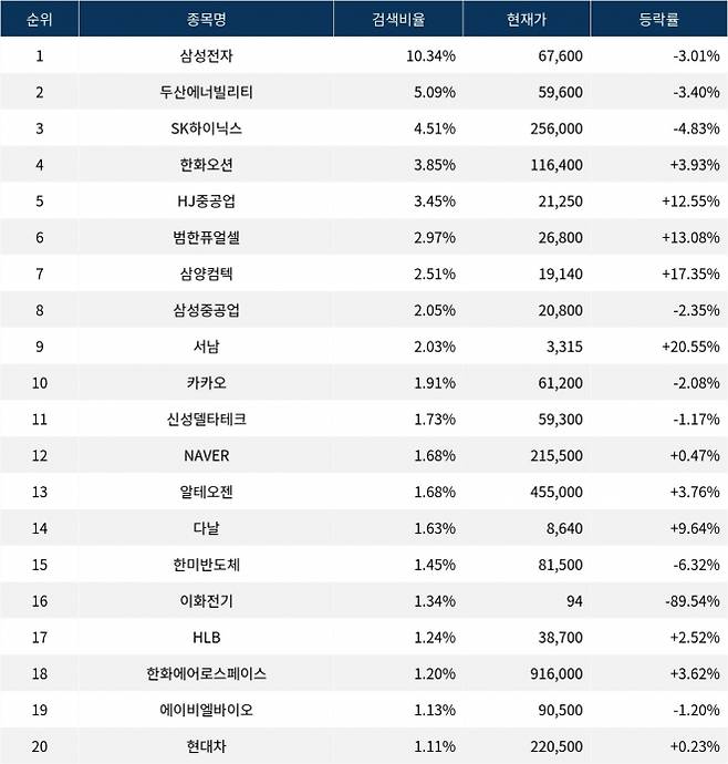 이어 검색비율 2위의 두산에너빌리티(034020)는 하락률 3.40%로 하락 마감했다. 검색비율 3위의 SK하이닉스(000660)는 4.83% 하락 마감했다. 검색비율 4위 한화오션(042660)은 상승률 3.93%로 상승 마감했다. 검색비율 5위 HJ중공업(097230)은 12.55% 급등 마감했다.