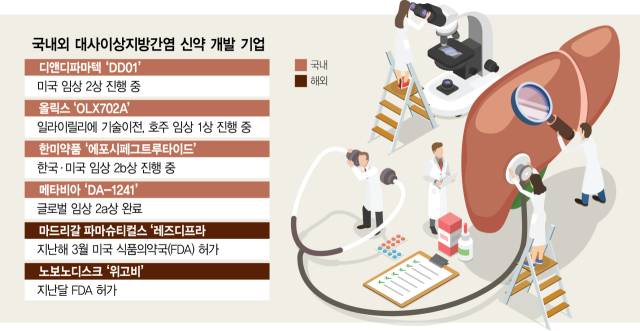 임상 기준이 완화되면 MASH 신약을 개발 중인 국내 제약·바이오 기업들도 탄력을 받을 것으로 예상된다. 글루카곤유사펩타이드(GLP)-1 계열의 MASH 신약 ‘DD01’의 미국 임상 2상을 진행 중인 디앤디파마텍(347850)이 대표적이다. DD01은 임상 2상 중간 결과에서 간 내 지방을 30% 이상 줄일 수 있다는 효과를 확인했다. DD01 투약군에서 12주차 평균 지방간 감소율은 62.3%로 위약군 평균(8.3%) 대비 우수했다. 디앤디파마텍은 이러한 결과를 바탕으로 글로벌 기술이전을 추진하고 있다.