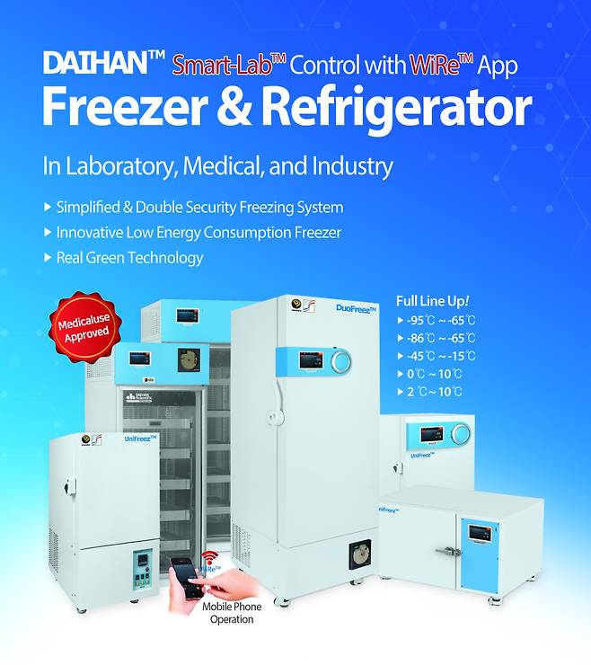 대한과학은 초저온 냉동고, 혈액·의약품 냉장고, 원심분리기 등 의료기기와 의료 소모품을 선보인다.