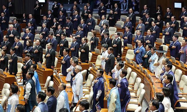 | 한복 vs 상복 … 갈라진 국회 1일 서울 여의도 국회에서 열린 정기국회 개회식에서 한복 차림의 더불어민주당 의원들과 검은 넥타이에 근조 리본을 단 국민의힘 의원들이 국기에 대한 경례를 하고 있다. 허정호 선임기자 |