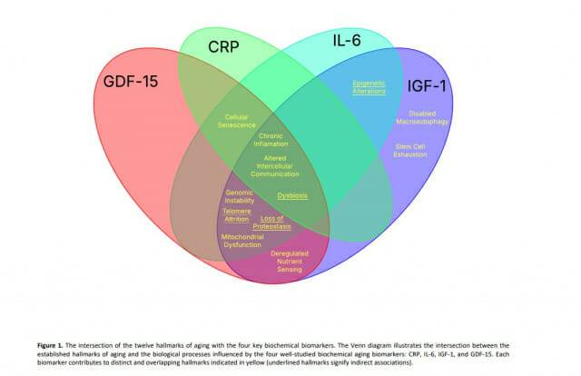 CRP는 염증 반응과 관련된 물질로 심혈관 질환, 당뇨병, 암과 연관이 있다. IGF-1은 성장 인자로서 장수, 근감소증, 대사 증후군과 관련되어 있으며, IGF-1 수치가 너무 높거나 낮으면 모두 질병 및 사망 위험 증가와 연관된다고 연구팀은 밝혔다. IL-6는 염증성 물질로 허약, 만성 염증, 신경 퇴행과 관련이 있으며, GDF-15는 스트레스 반응성 물질로 미토콘드리아 기능 장애와 세포 스트레스의 지표 역할을 한다.