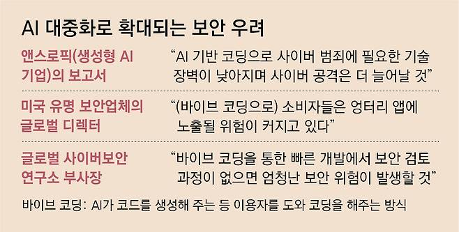 보안 업계에서는 AI의 대중화로 섀도 AI, 바이브 코딩 등 새로운 보안 위협이 발생하고 있는 만큼 ‘AI 거버넌스 정책’을 제대로 정립하는 것이 중요하다고 강조한다. 임종인 고려대 정보보호학과 명예교수는 “생성형 AI의 사용을 막기란 현실적으로 불가능하기 때문에 내부 직원들에게 AI 사용 가이드라인 등을 꾸준히 인식시키는 게 중요하다”고 했다. 한 대기업 보안 전문가는 “AI로 프로그래밍의 장벽이 낮아진 것은 긍정적이지만 반드시 보안 검증을 거쳐야 기업과 프로그램 사용자 모두 사이버 위협으로부터 안전할 수 있다”고 했다.