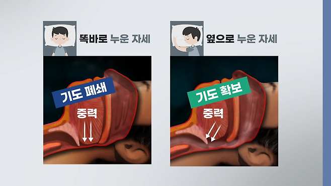반면 "옆으로 돌아누우면 중력은 그대로인데, 인체에 작용하는 힘의 방향이 옆으로 바뀐다"며 "턱과 혀가 옆으로 쏠리게 돼 기도를 누르는 효과가 줄어들고 뒤쪽 기도 공간이 유지된다"고 말했습니다.