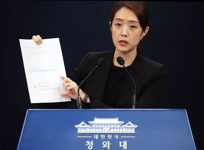 | ▲ 4일 오후 청와대에서 고민정 대변인이 김기현 전 울산시장 비리 의혹 제보 경위 및 문건 이첩에 관한 브리핑을 하고 있다. 브리핑 중 고 대변인이 고래고기 관련 문건을 보여주고 있다. 2019. 12. 4 |