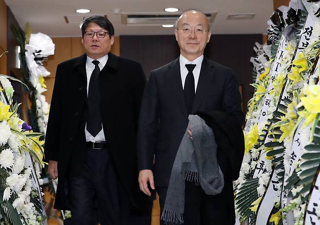 | ▲ 김조원 청와대 민정수석이 3일 오전 서울 서초구 서울성모병원 장례식장에 마련된 전 청와대 민정비서관실 특별감찰반 수사관의 빈소 조문을 마친 후 장례식장을 나서고 있다. 왼쪽은 이광철 민정비서관. 2019. 12. 3. |