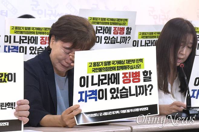 | ▲ 8월 20일 서울 마포구 군인권센터 사무실에서 군 사망사건 유가족, 현역 장병 부모 모임, 군인권센터가 연 '국가배상 항소심 재판부 탄핵 청원 개시' 기자회견 도중 고 홍정기 일병 어머니 박미숙씨가 눈물을 흘리고 있다. |